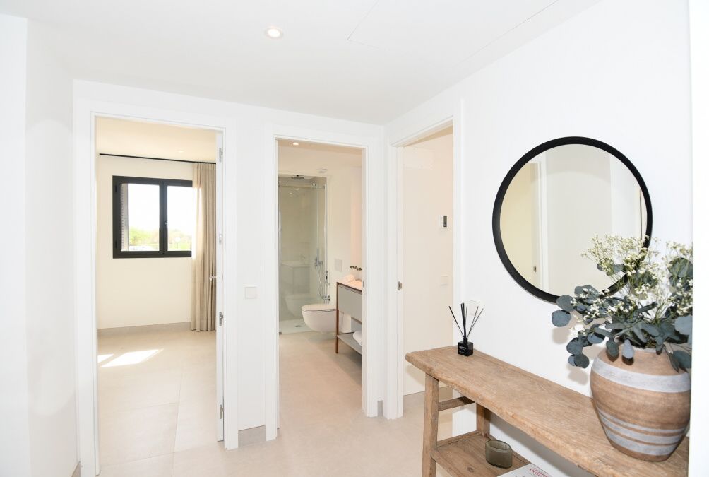 Nicht weit vom Strand Es Trenc entfernt, private Wohnanlage mit Fitnessraum, großem Salzwasserpool, Gemeinschaftsgärten, Erdwärme, Nutzung der unter der Erdoberfläche gefundenen Wärme durch Verwendung einer Wärmepumpe, die in der Lage ist, Häuser mit Heizung und Klimaanlage zu klimatisieren Kühlsystem mit einem sauberen und erneuerbaren System.